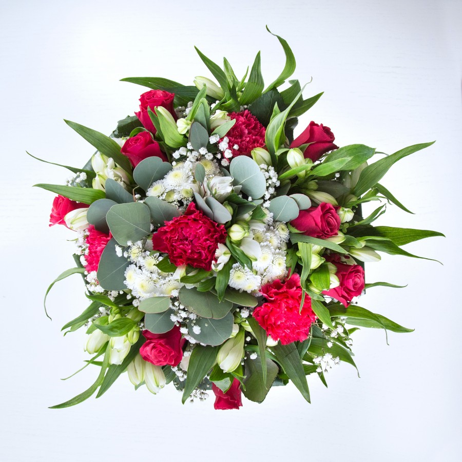 Immerse yourself in the beauty and uniqueness of our stunning bouquet. This arrangement showcases a harmonious blend of sweet white chrysanthemums, delicate gypsophila, vibrant red roses, and charming carnations. Enhanced with pristine white alstroemeria and lush aspidistra leaves, each flower is thoughtfully selected to create a visually captivating display.